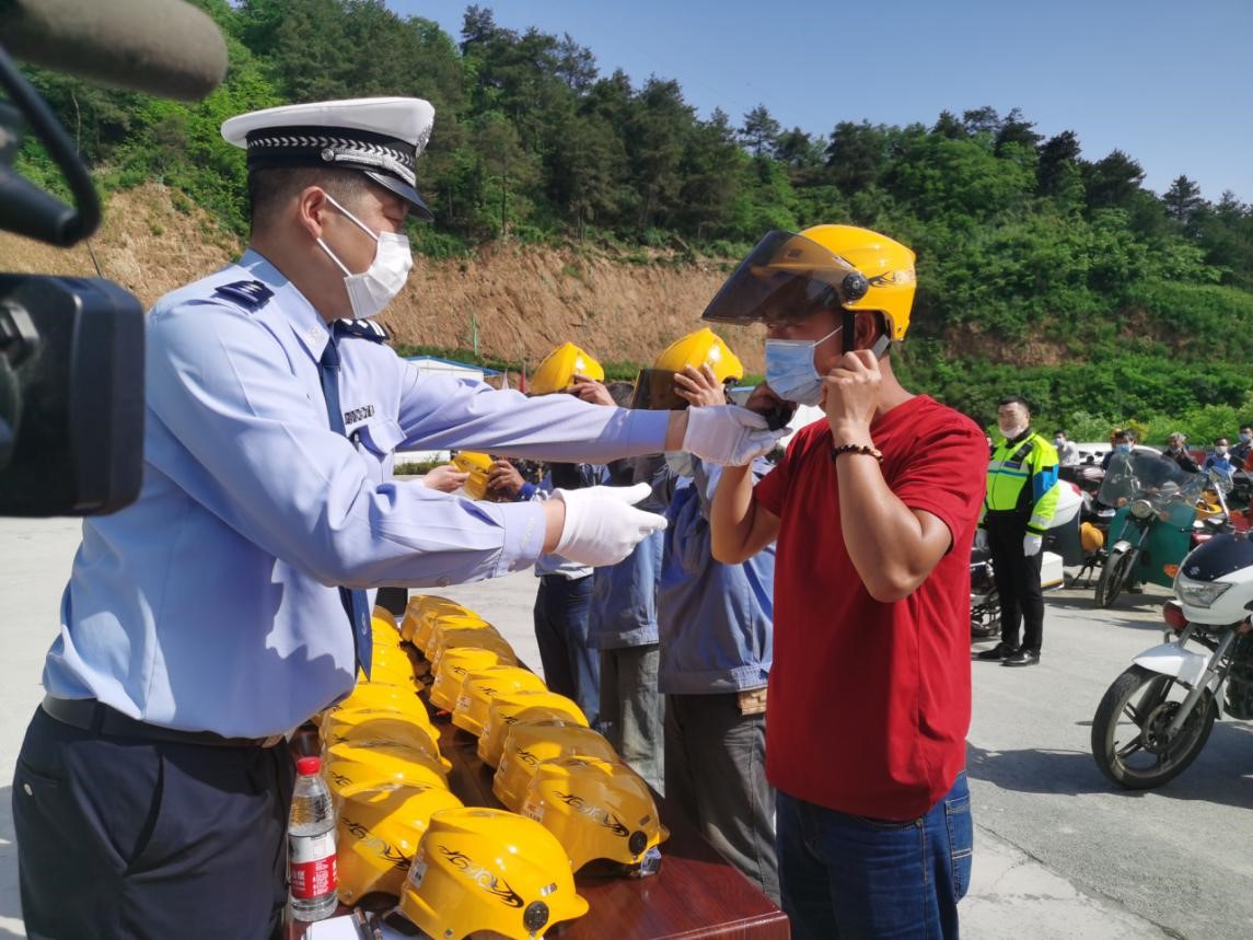交管局領(lǐng)導指導務(wù)工人員正確佩戴頭盔