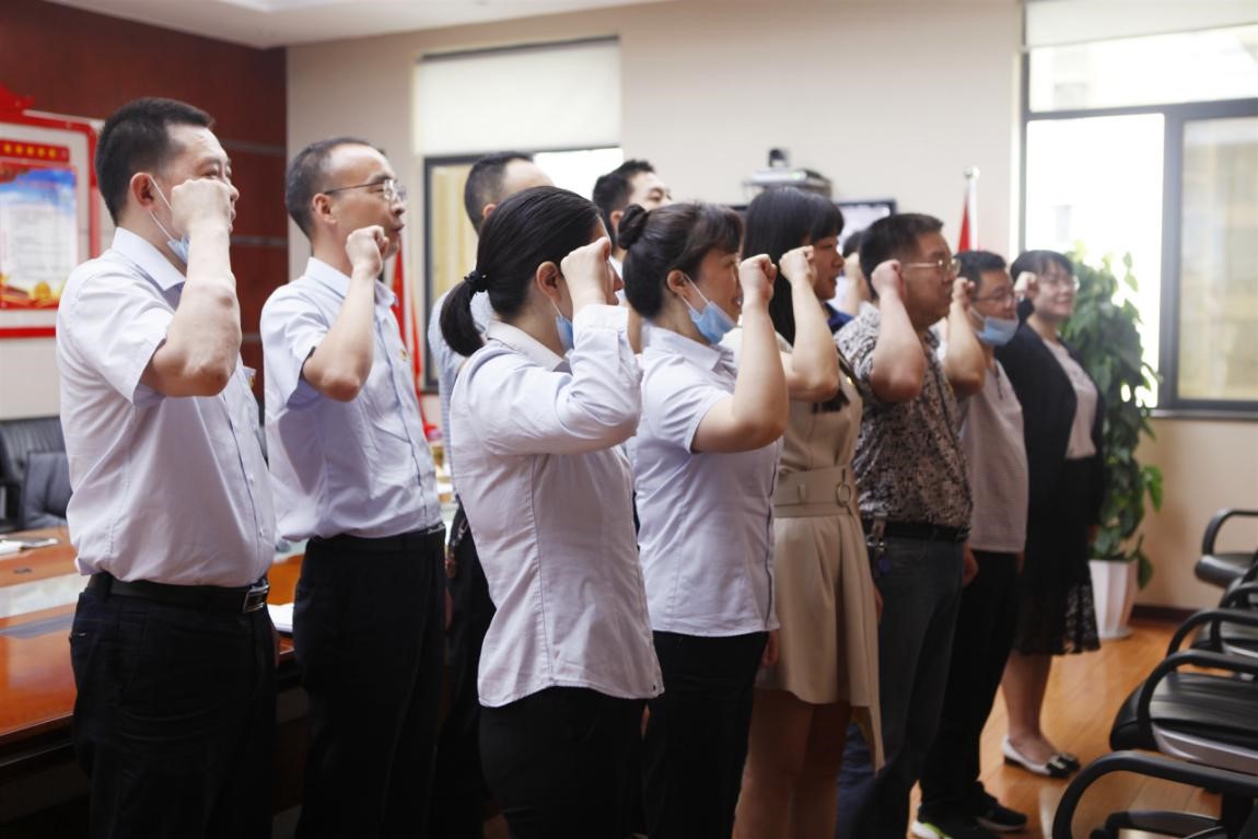 首先,全體參會人員在鮮紅的黨旗前莊嚴(yán)地舉起右手,握拳宣誓,重溫入黨誓詞,再次接受了心靈的洗禮。